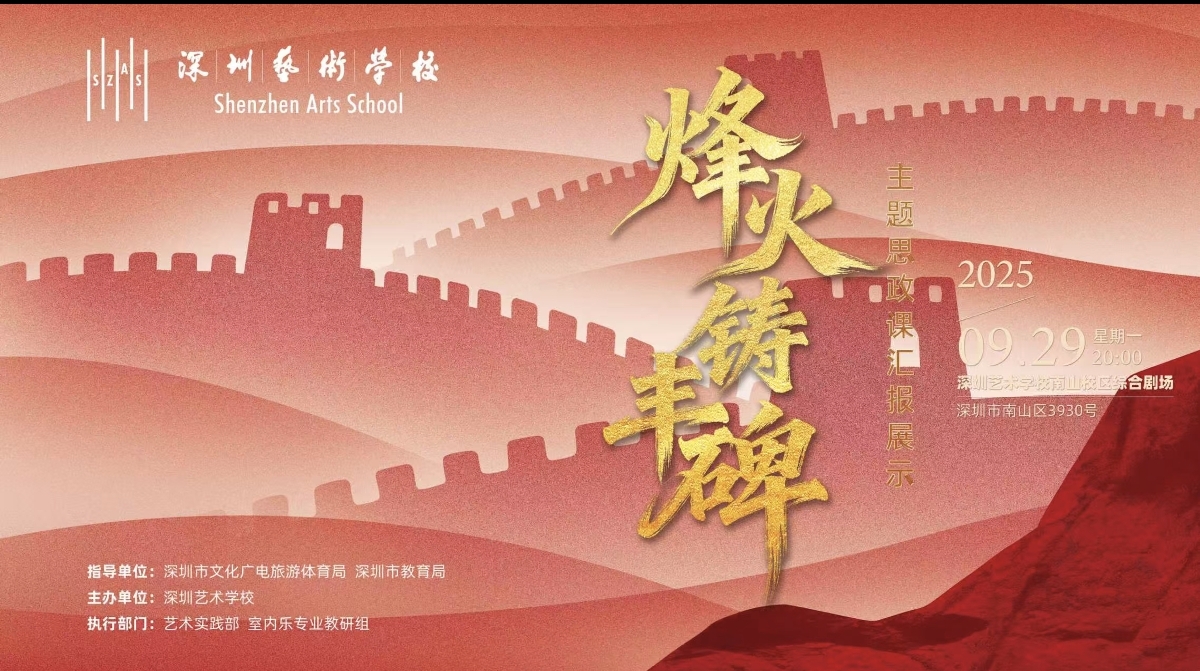 9月29日晚,深圳艺术学校将在综合剧场举办沉浸式主题思政音乐会。这场以"烽火铸丰碑"为核心的演出,通过四个篇章串联起中华民族的抗争史诗:从《松花江上》的悲怆呐喊到《黄河大合唱》的磅礴怒吼,用钢琴、琵琶