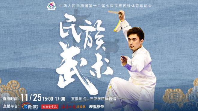 第十二届全国少数民族传统体育运动会正在海南三亚举行。快来一起感受民族武术的魅力,此次直播比赛项目有女子传统二类拳、女子传统三类拳、男子对练。